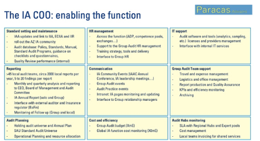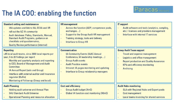 As Group CAE (900 auditors, 45 teams globally), I quickly realized that I needed support, in 9 areas: the internal standards setting, people management, IT solutions development and maintenance, communication, reporting, planning, budget and KPIs development and oversight, logistics of the Group Audit (GA) central team, SLA management and invoicing.